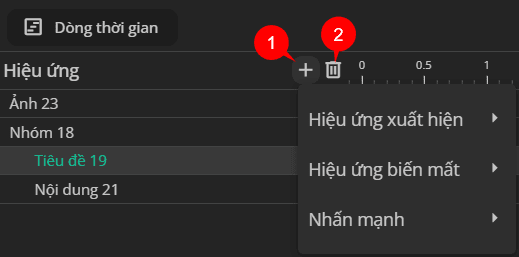 Xóa hiệu ứng bằng cách chọn hiệu ứng trên Dòng thời gian và nhấn nút Xóa hiệu ứng (2), hoặc nhấn phím Delete.