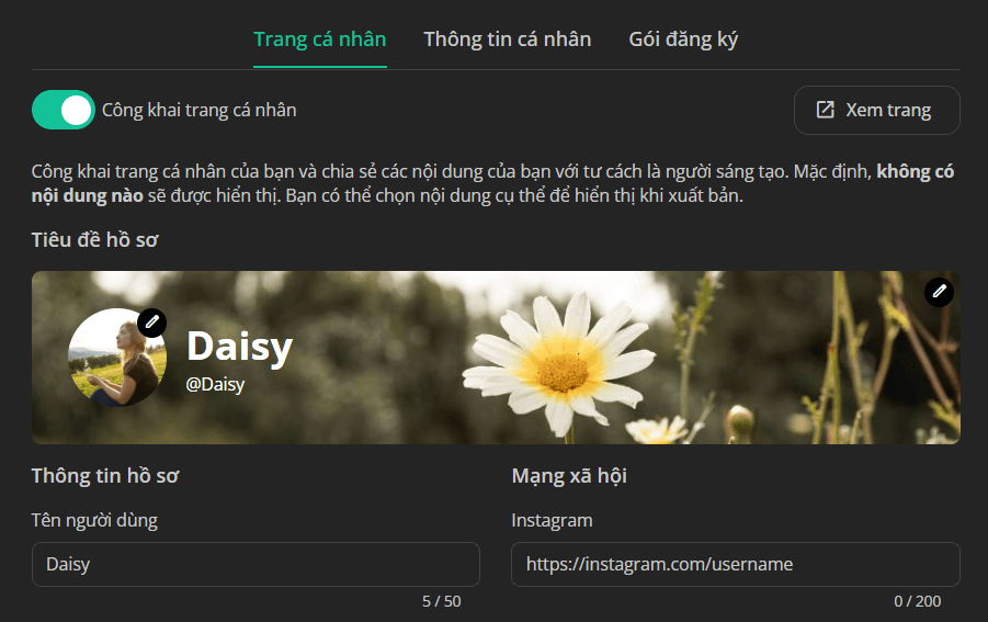 Điền thông tin hồ sơ của bạn, sau đó bật nút Công khai trang cá nhân.