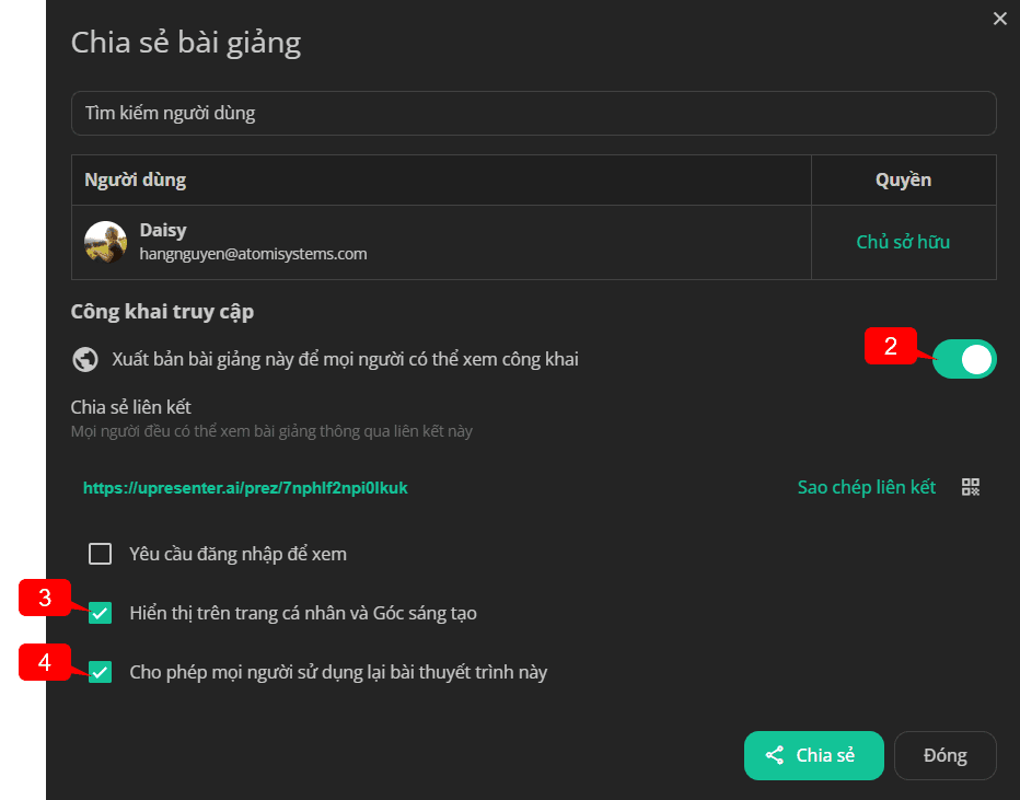 Trượt nút Xuất bản bài giảng này để mọi người có thể xem công khai để bài giảng trở thành công khai.