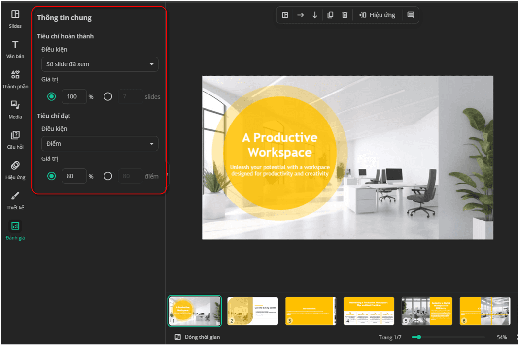 (1) Bạn thiết lập Tiêu chí hoàn thành và Tiêu chí đạt do bạn đặt ra (theo điểm hoặc số slide đã xem) trong mục Đánh giá ở thanh menu phía tay trái.