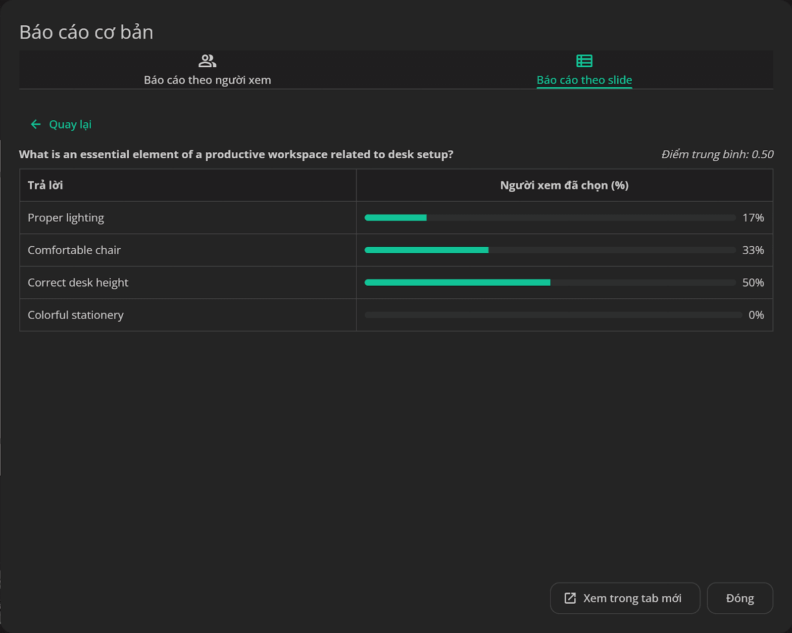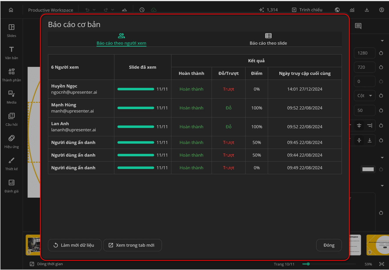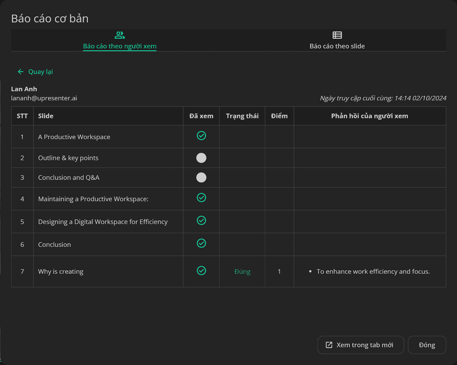 Trong báo cáo theo người xem, bạn có thể quan sát mức độ tham gia của người học bằng cách theo dõi slide nào họ đã xem cũng như các câu trả lời và phản hồi của họ.