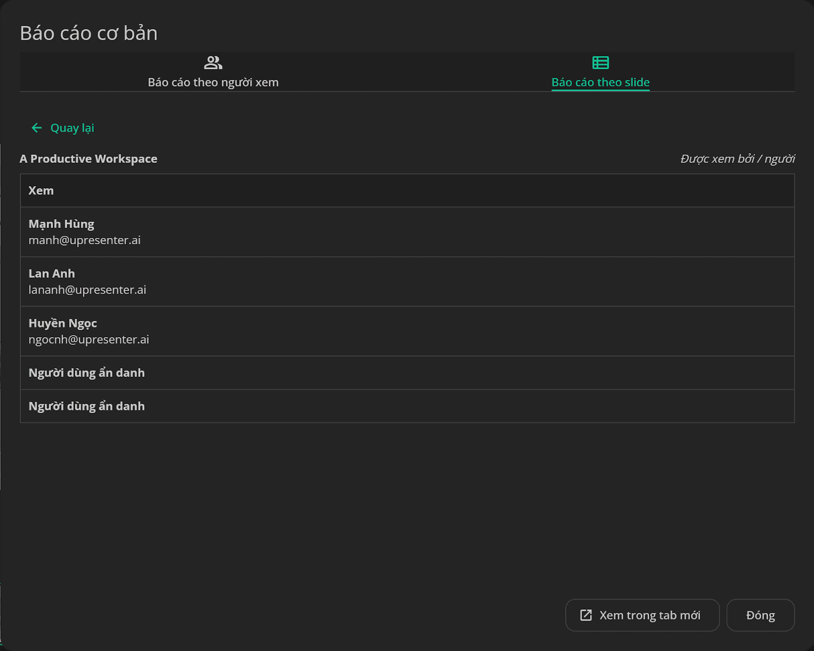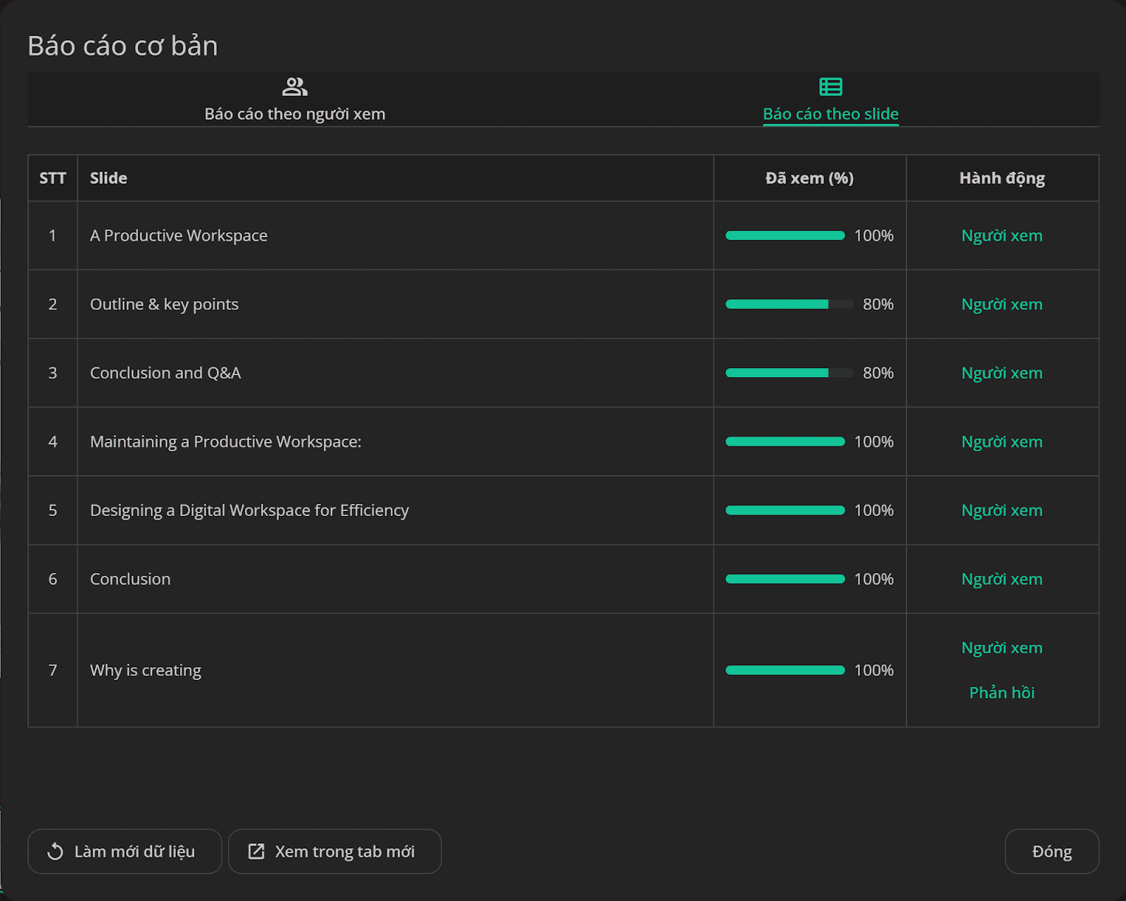 Nói tóm lại, báo cáo theo slide cung cấp một góc nhìn tổng hợp khác bằng cách lấy slide làm cột mốc đo lường. Khi nhấp vào Người xem, báo cáo sẽ liệt kê số lượng người học đã xem slide này.