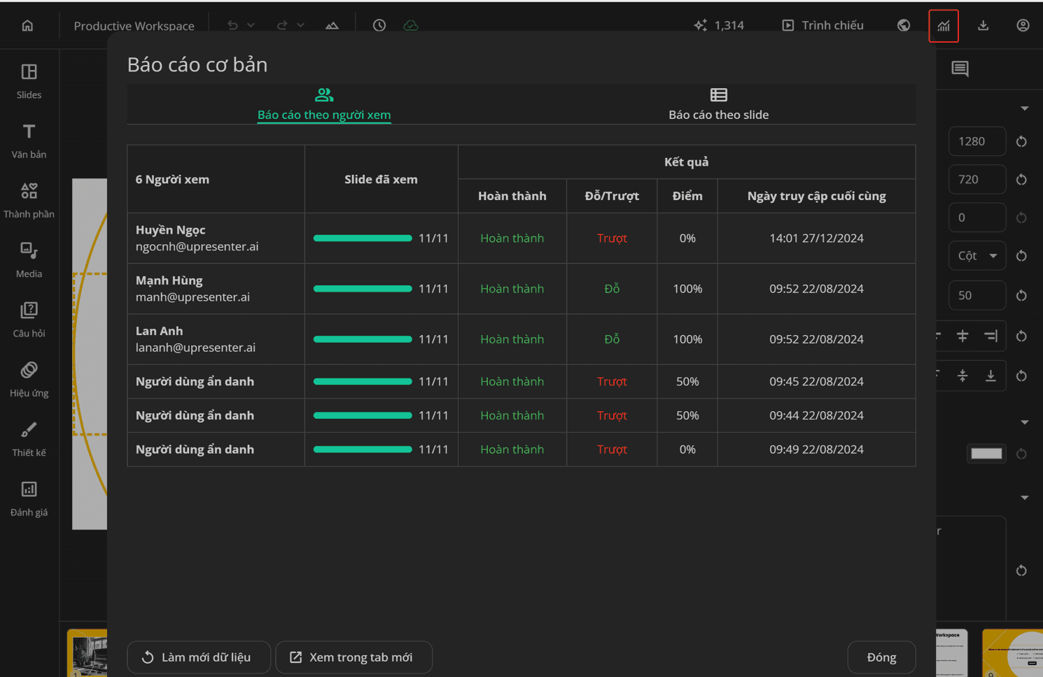 Khi sử dụng uPresenter, bạn có thể theo dõi hoạt động và mức độ tương tác của người học trong thời gian thực. Bạn di chuột tới tới Báo cáo ở thanh menu trên cùng bên phải để xem số liệu phân tích.